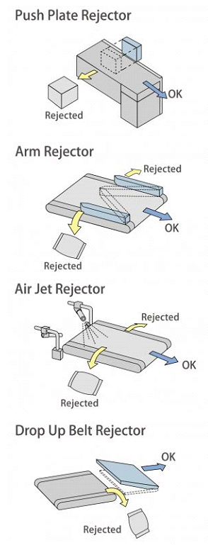 برای حذف خودکار محصولات معیوب از خط، از رجکتورها استفاده میشود. انواع آنها عبارتند از: